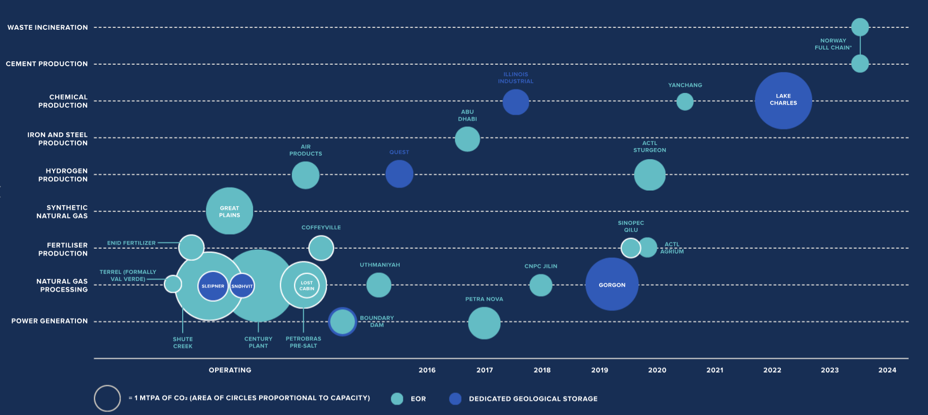 Power and industrial applications of commercial large-scale CCS facilities with actual and expected operation dates up to 2024
