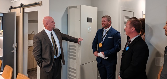 "There may be instances where the utility will require half of" the available battery reserves, Nic Evans, Auric Energy, told reporters in a completed Soleil Lofts apartment. Evans helped design the system used in the project.
