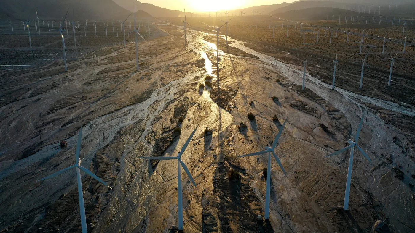 Remnants of floodwaters beneath wind turbines after Tropical Storm Hilary inundated the area on Aug. 22, 2023, in Palm Springs, Calif.